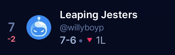 Failing to follow up last week’s win with a victory over Blue (blueballs; 108.6pts), Will (Leaping Jesters; 76.44pts) put up under 100pts for the fourth time in five weeks to fall to 7th-place and out of the playoff picture for the first time since Week 1.
